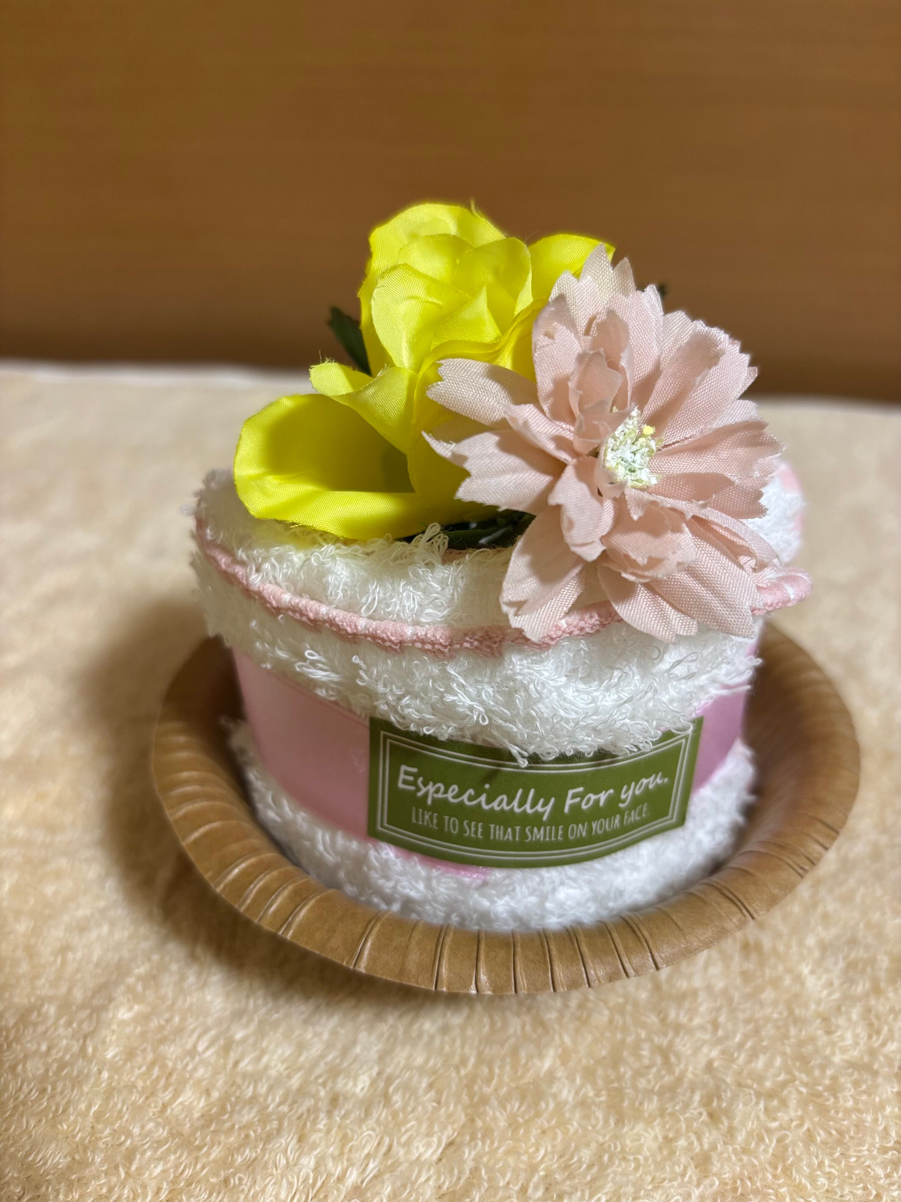 ハンカチサイズの今治タオルは思わずうふっとほほえむようなやわらかいはだざわり♪ かわいいケーキ型ギフトは使うのがもったいないくらいかわいい仕上がりです♡