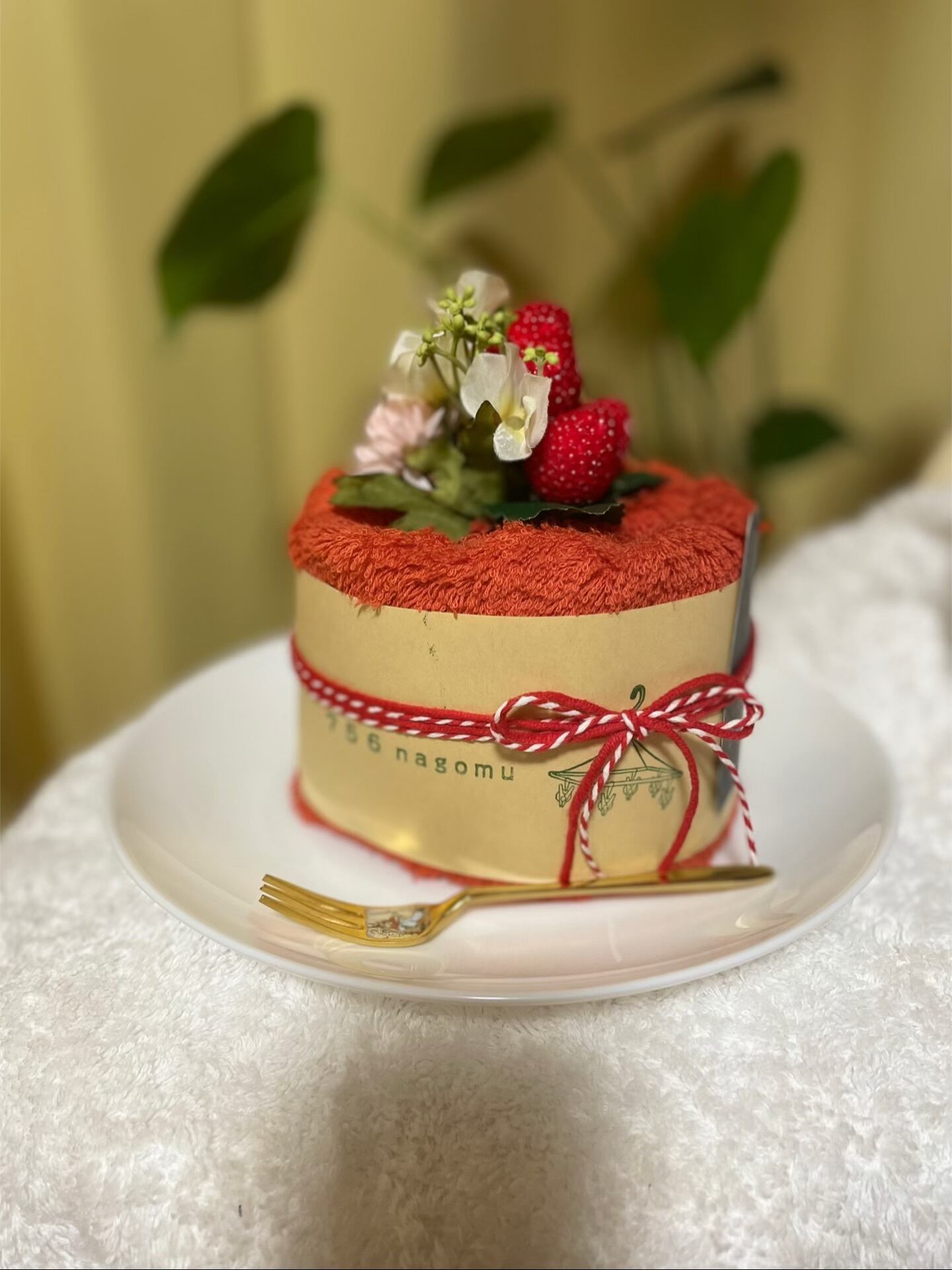 デコレーションした今治タオル屋さんのケーキ風のタオルギフトです